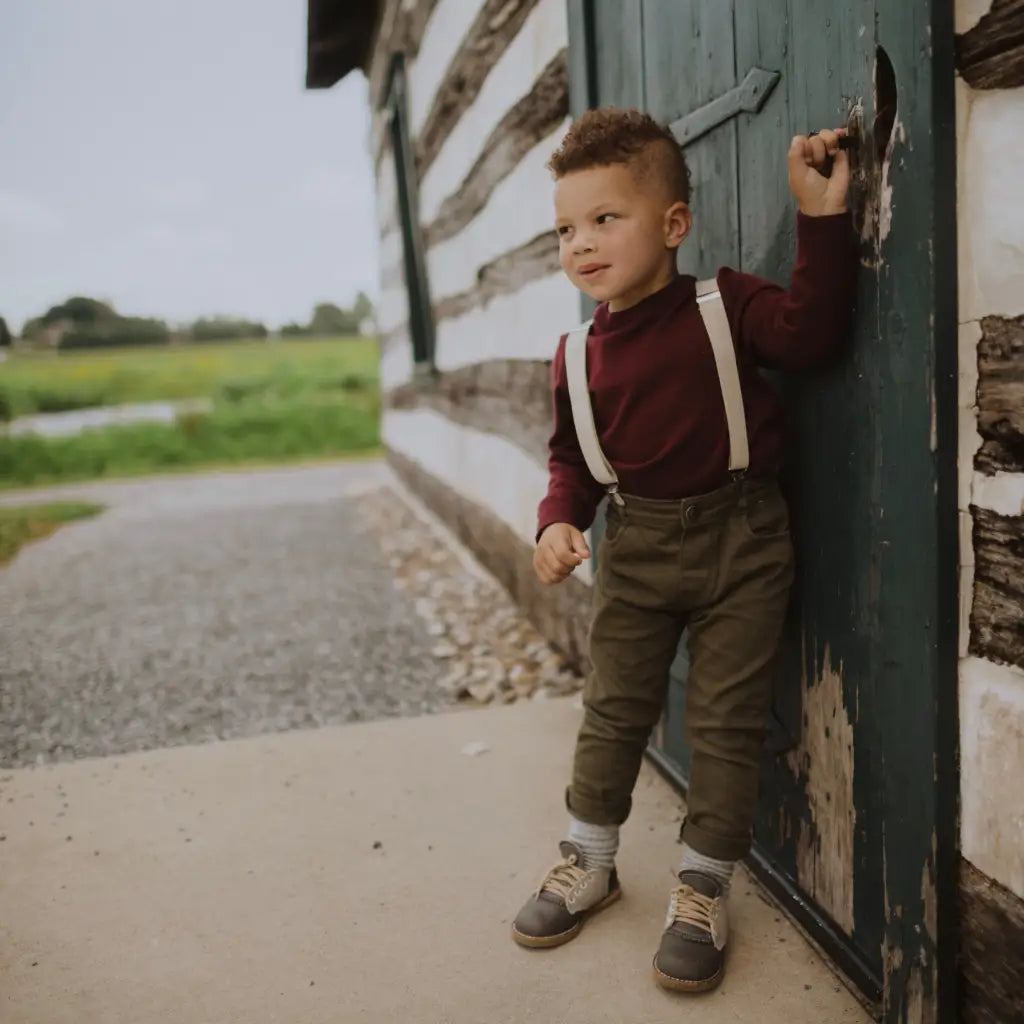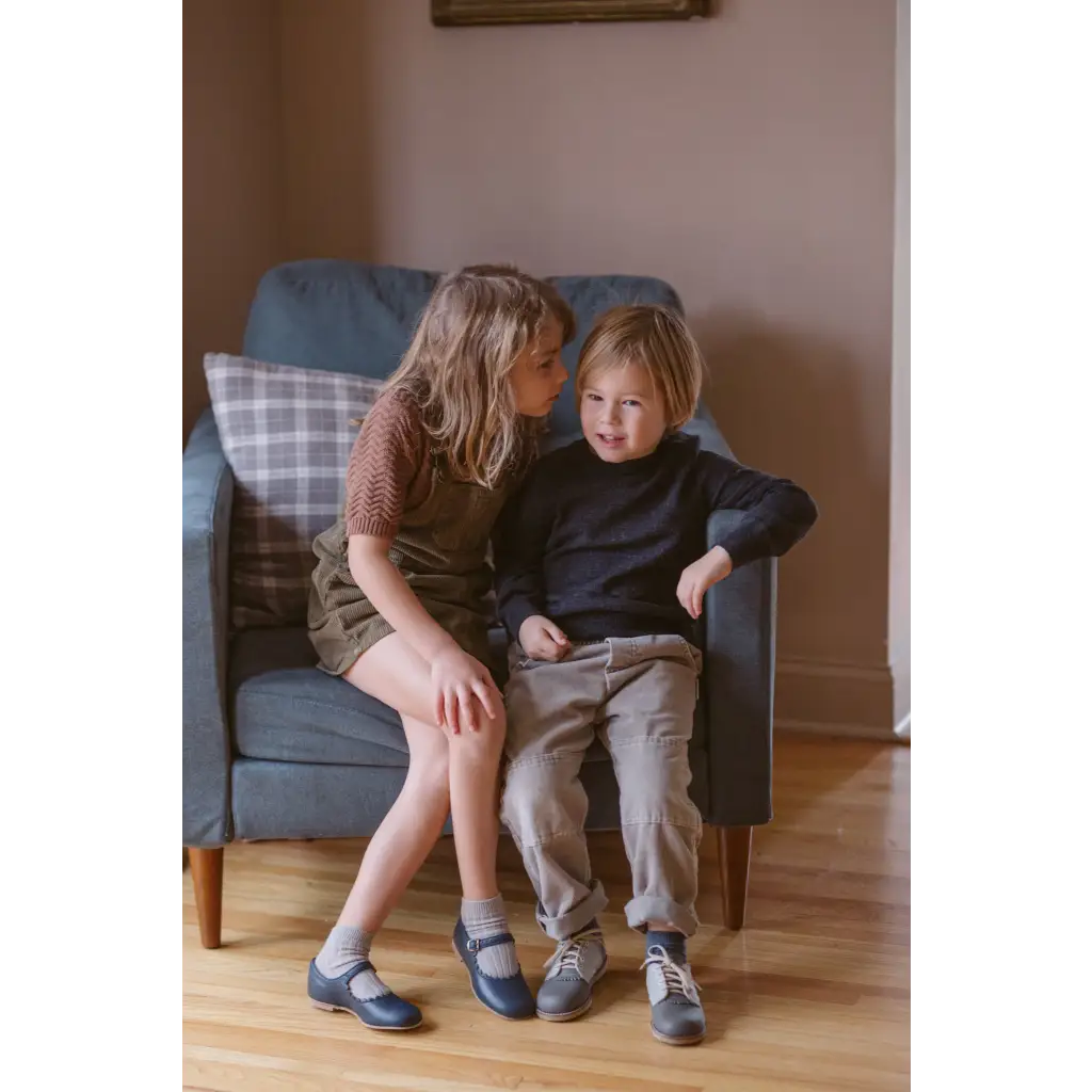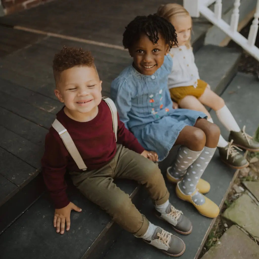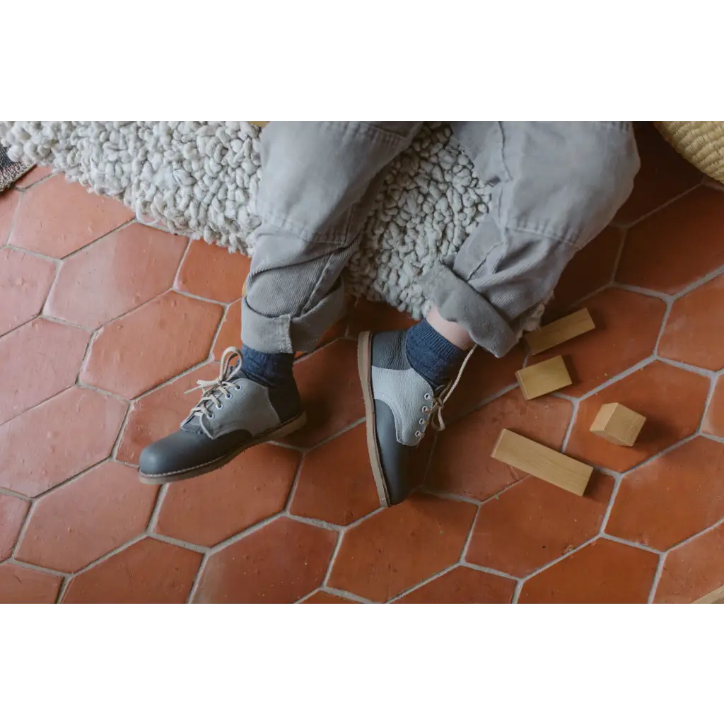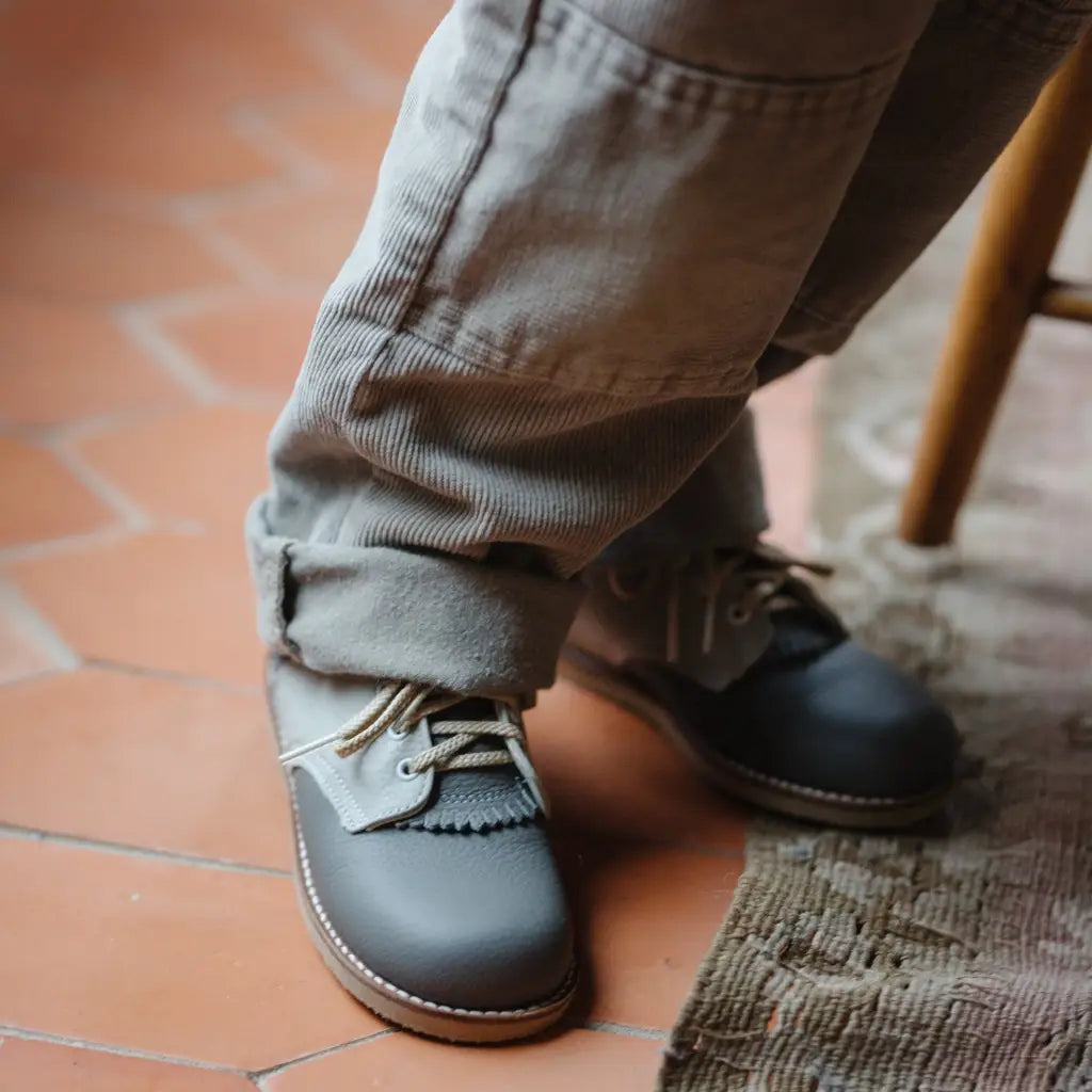 The Artie Saddle in Dark Grey/Dove Grey is made of top grain leather and fully lined in breathable leather to wick away moisture. The combination of a breathable split leather insole and a textured crepe sole make for shoe that's light and flexible while giving your little one lots of traction for exploring.