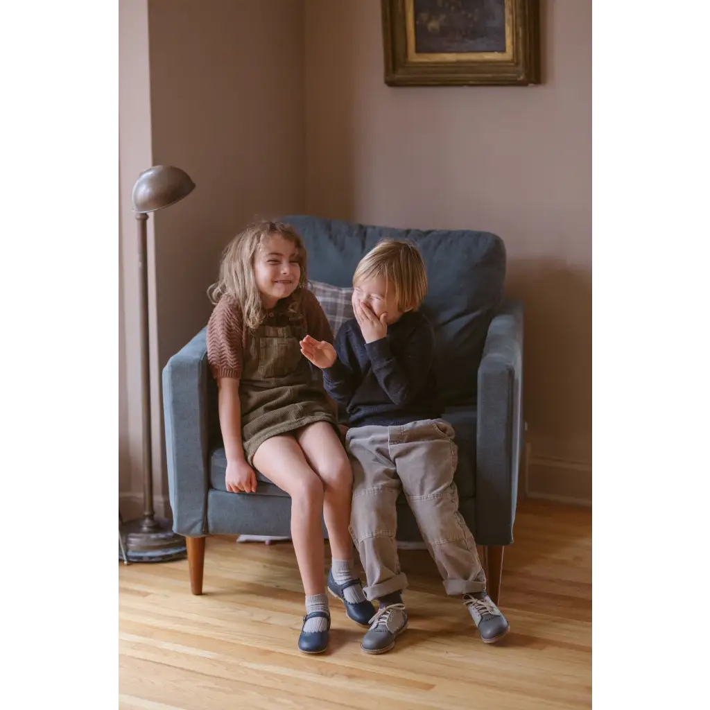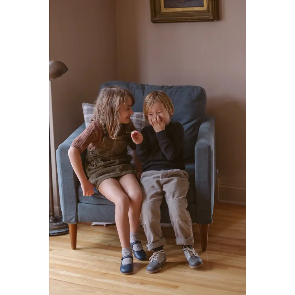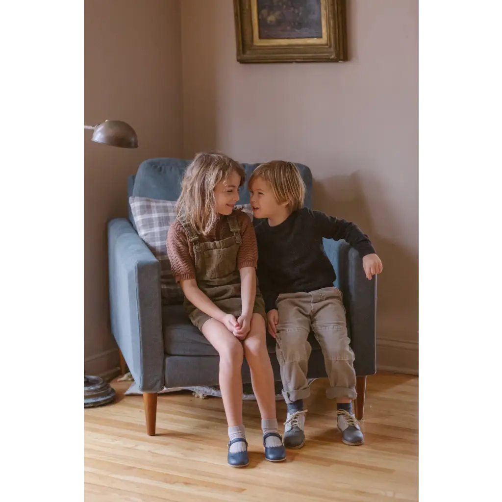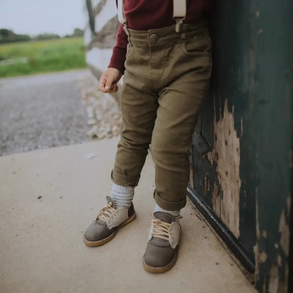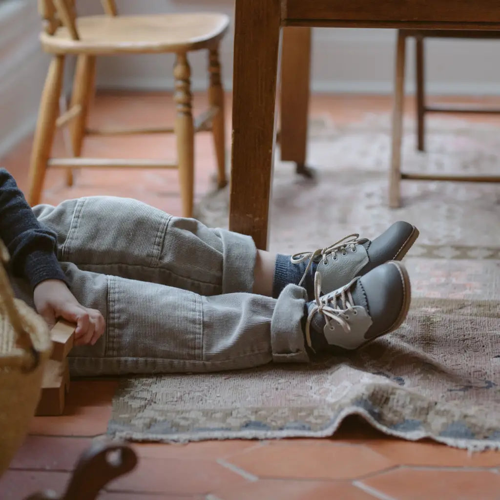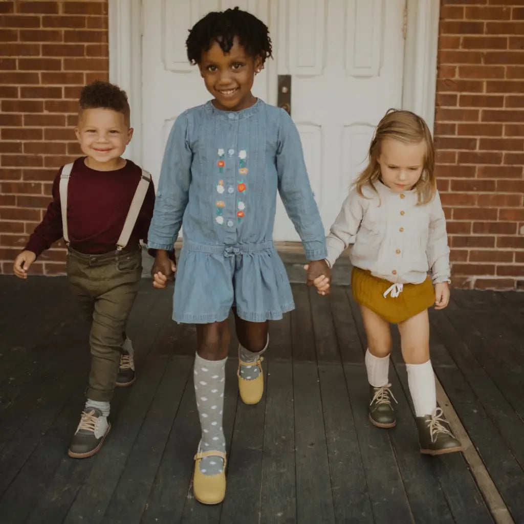 The Artie Saddle in Dark Grey/Dove Grey is made of top grain leather and fully lined in breathable leather to wick away moisture. The combination of a breathable split leather insole and a textured crepe sole make for shoe that's light and flexible while giving your little one lots of traction for exploring.