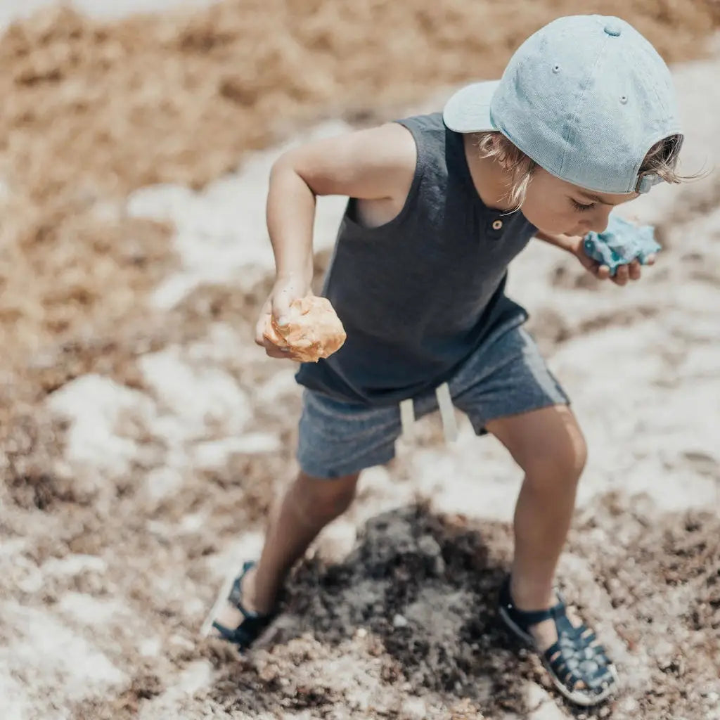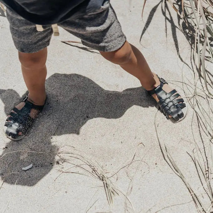 The closed toe Audrey Sandal is made with navy leather and features an adjustable ankle strap. The structure of the shoe and the flexible sole provide stability without weight to support your child's early steps. The perfect style to transition from spring to summer!