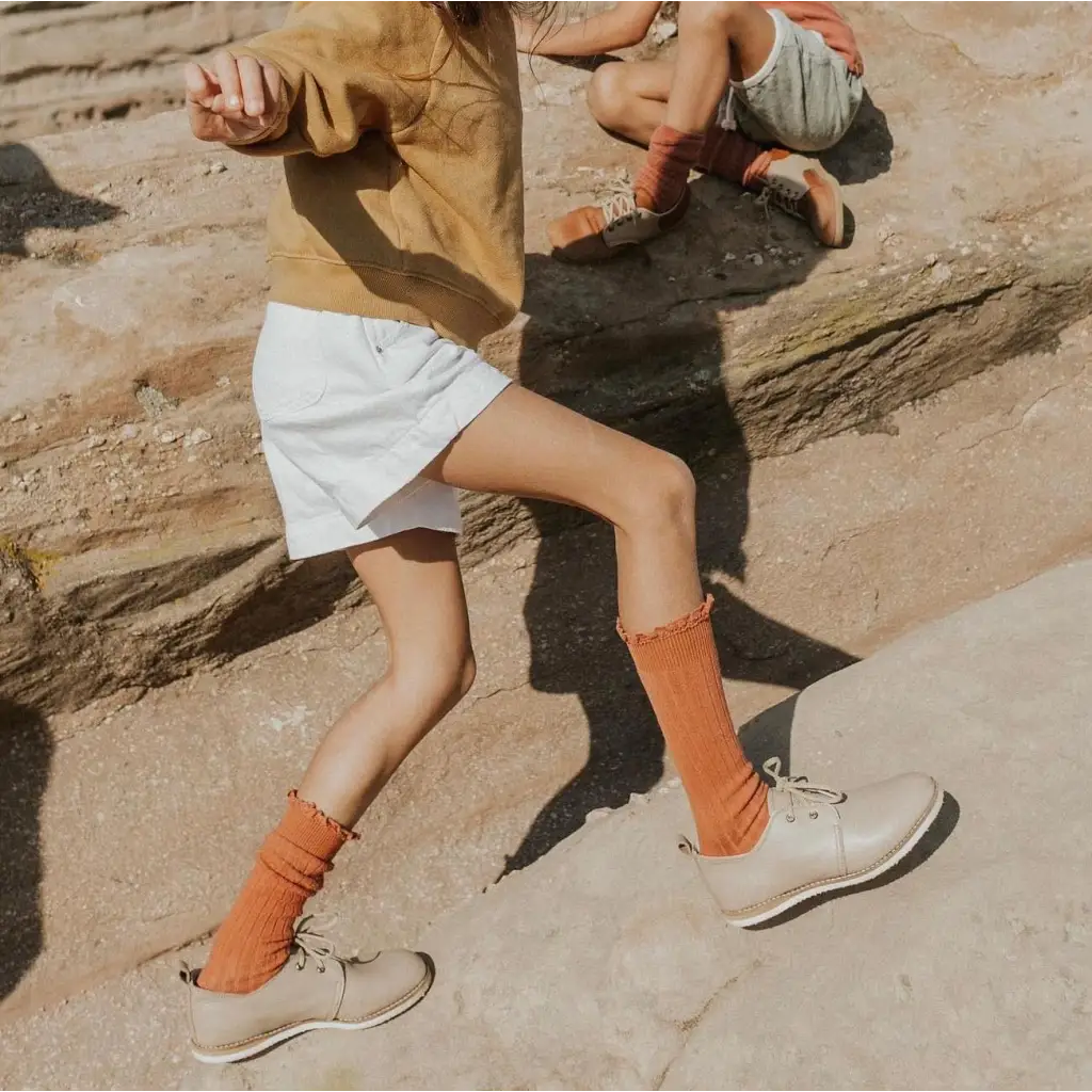 The Charlie Oxford in Truffle is made of top grain leather and fully lined in breathable leather to wick away moisture. The combination of a breathable split leather insole and a textured crepe sole make for shoe that's light and flexible while giving your little one lots of traction for exploring. A fall favorite for both girls and boys!