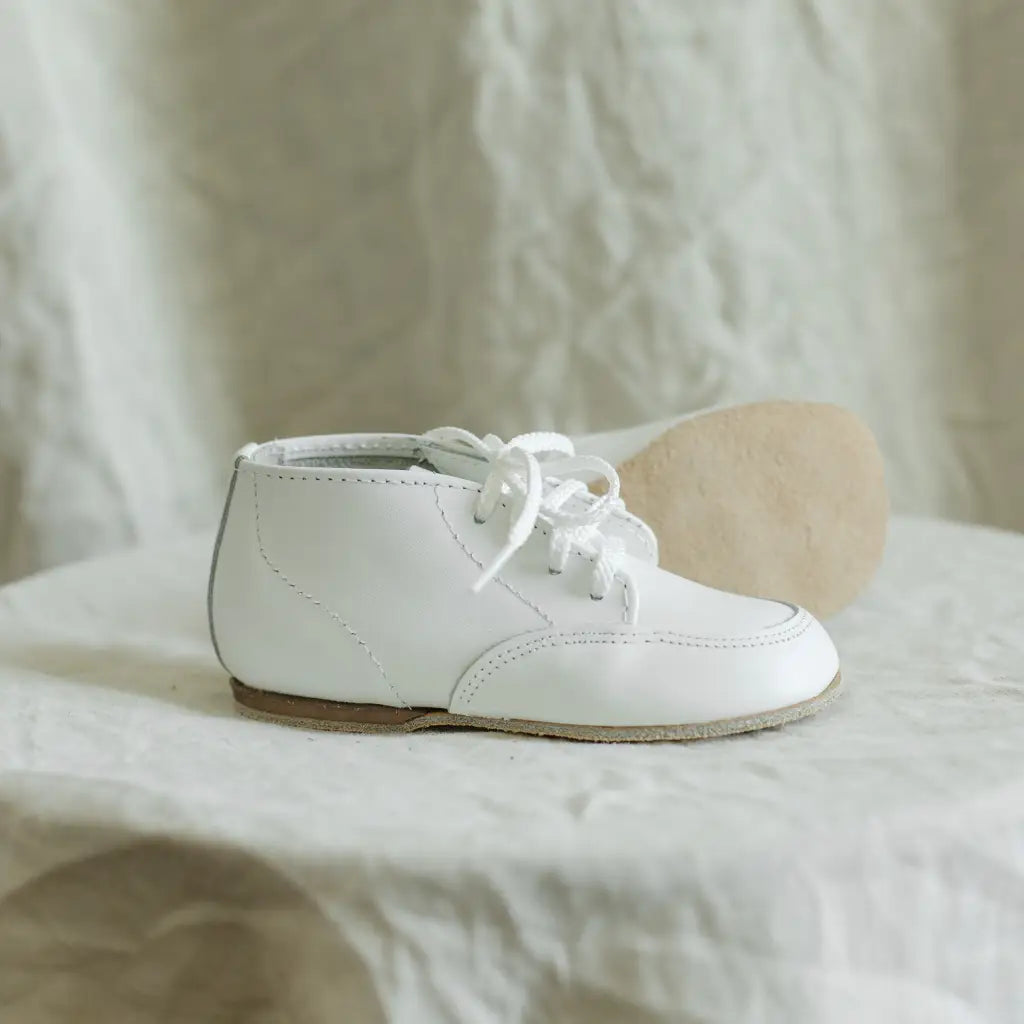 The Right Step Oxford is made of white leather and lined with breathable leather and cotton which work together to draw out any moisture. The structure of the shoe and the flexible sole provide stability without weight to support your child's early steps. Designed specifically for infants in mind!