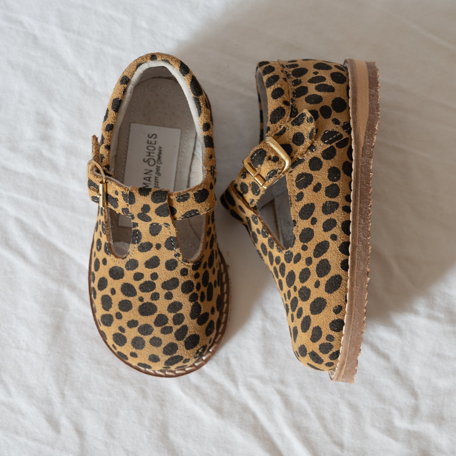 The Flora T-Strap in Cheetah is made of camel top grain leather and lined in breathable leather which wicks away moisture. The structure of the shoe and the flexible rubber sole provide stability without weight to support your little one's early steps. Perfect for everyday wear or special occasions!