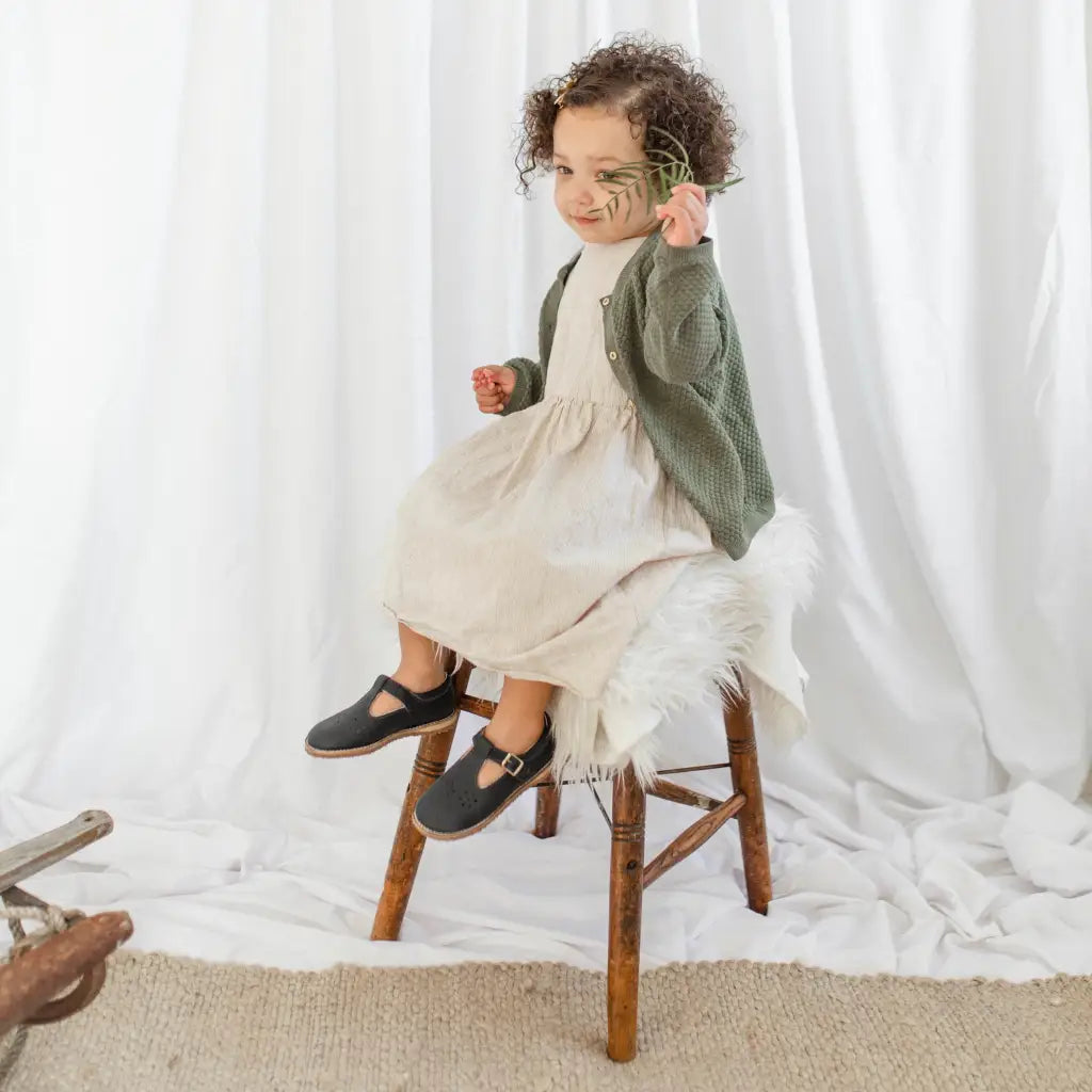 The Flora T-Strap in Navy is made of navy top grain leather and lined in breathable leather which wicks away moisture. The structure of the shoe and the flexible rubber sole provide stability without weight to support your little one's early steps. We added an adorable floral perforation across the toe and a padded collar around the ankle. Perfect for everyday wear or special occasions.