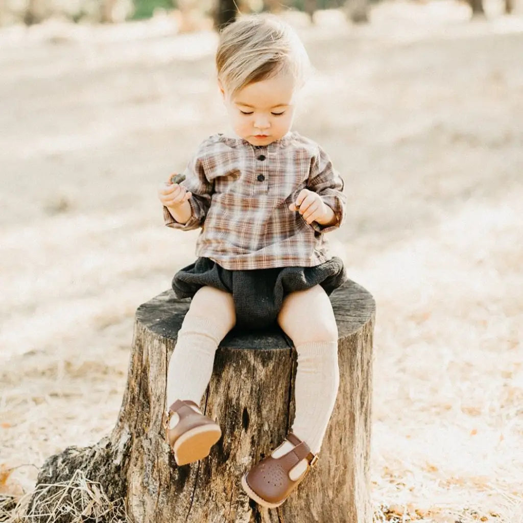 The Greta T-Strap in Dark Brown is made of soft leather upper and lined in breathable leather which wicks away moisture. The structure of the shoe and the flexible rubber sole provide stability without weight to support your little one's early steps. We added an adorable teardrop perforation across the toe and a padded collar around the ankle. Perfect for everyday wear or special occasions.