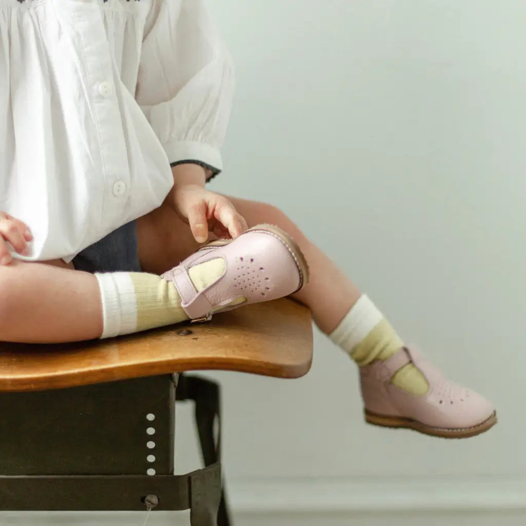The Greta T-Strap in Peony is made of soft leather upper and lined in breathable leather which wicks away moisture. The structure of the shoe and the flexible rubber sole provide stability without weight to support your little one's early steps. We added an adorable teardrop perforation across the toe and a padded collar around the ankle. Perfect for everyday wear or special occasions.