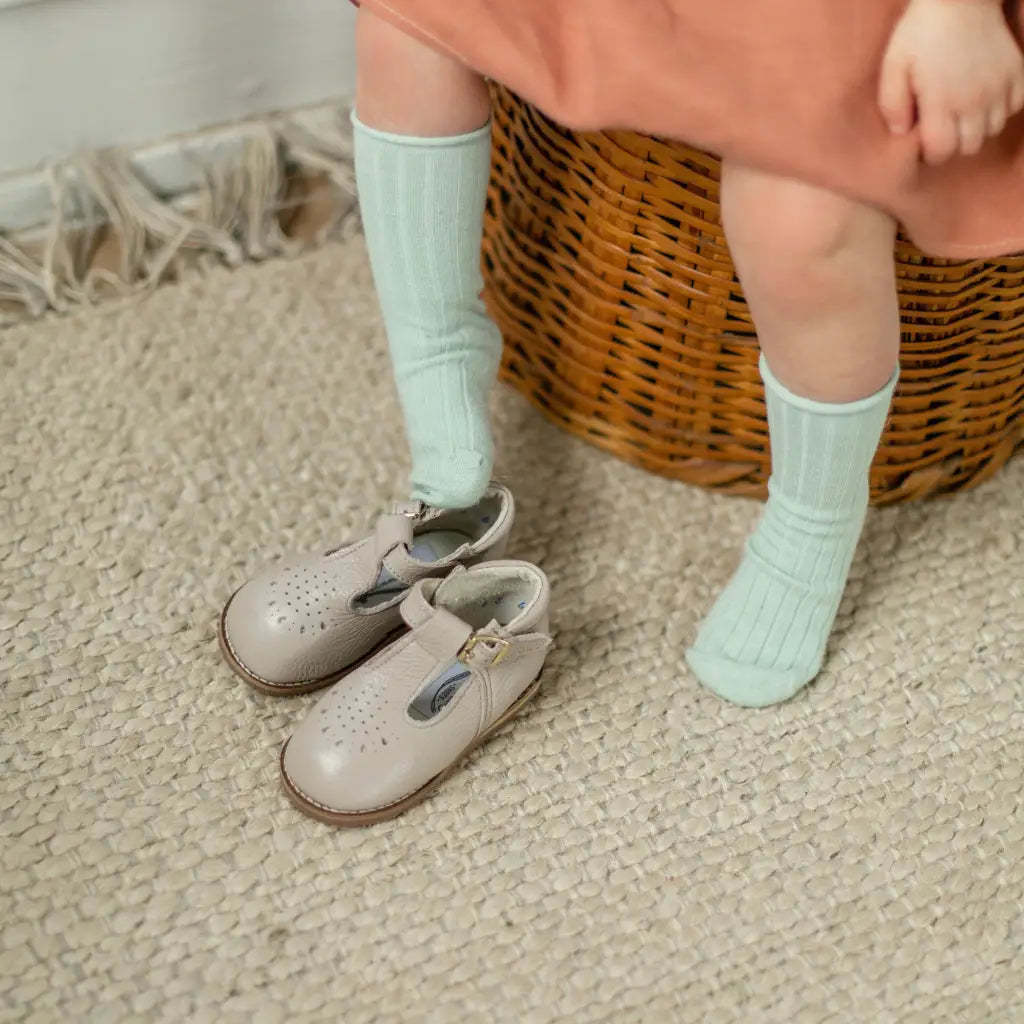 The Greta T-Strap in Sand is made of soft leather upper and lined in breathable leather which wicks away moisture. The structure of the shoe and the flexible rubber sole provide stability without weight to support your little one's early steps. We added an adorable teardrop perforation across the toe and a padded collar around the ankle. Perfect for everyday wear or special occasions.