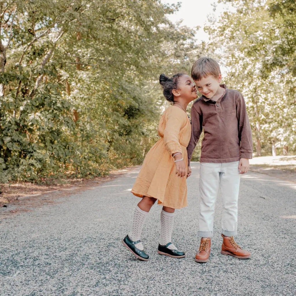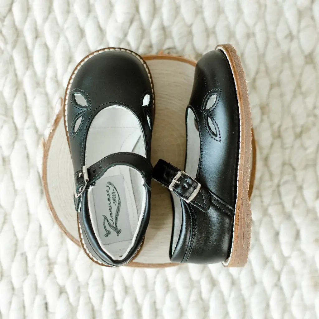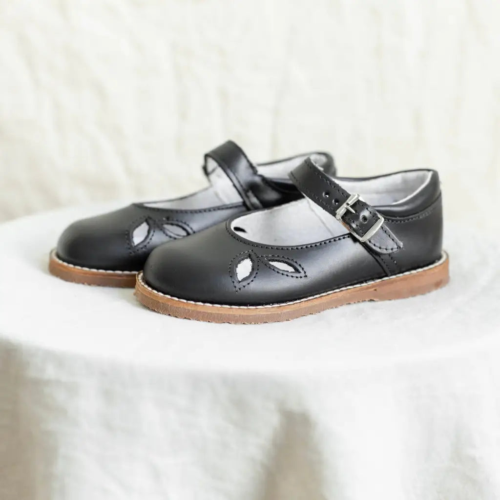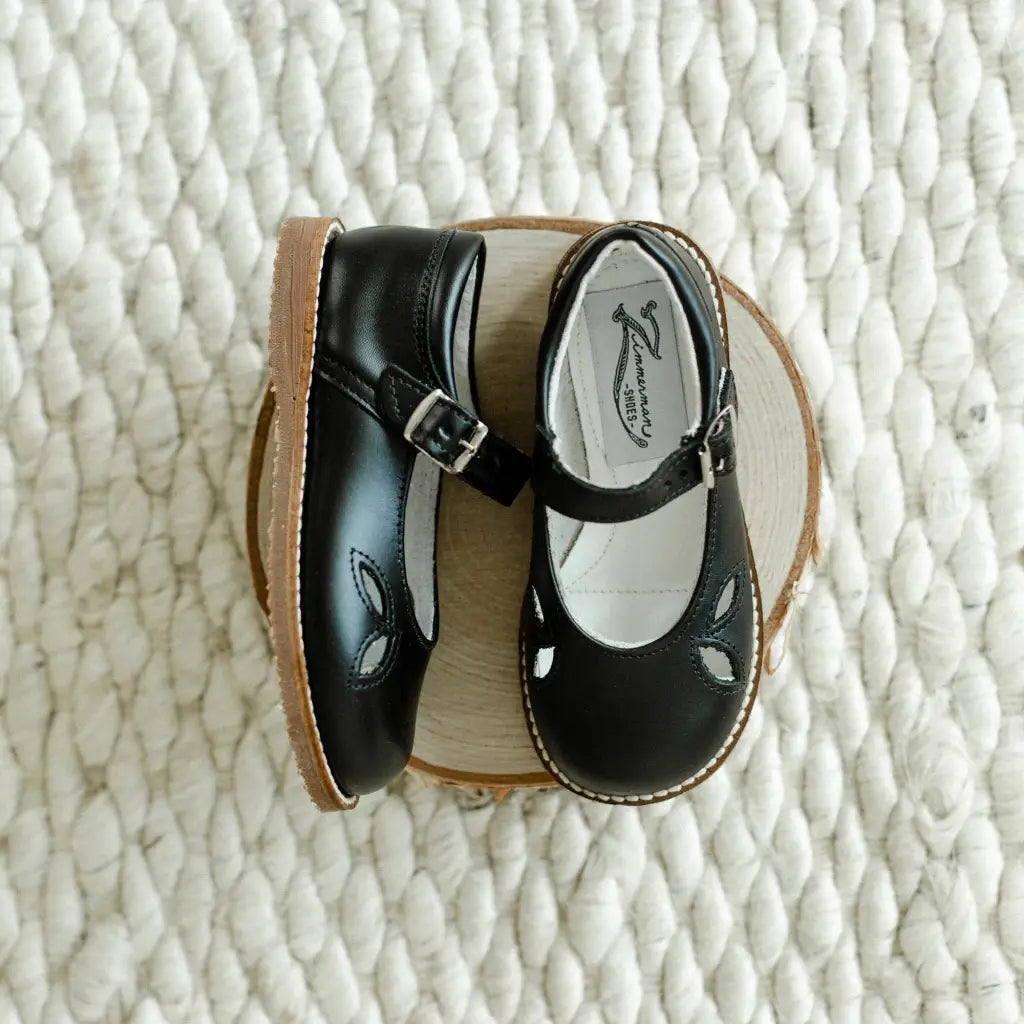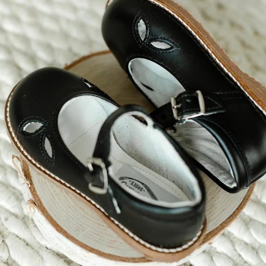 The Josie Mary Jane is made of black leather and lined with breathable leather and cotton which work together to draw out any moisture. The structure of the shoe and the flexible sole provide stability without weight to support your child's early steps.