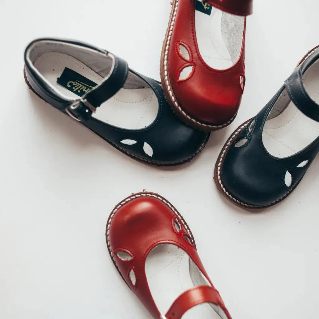 The Josie Mary Jane is made of red leather and lined with breathable leather and cotton which work together to draw out any moisture. This style features an adjustable ankle strap. The structure of the shoe and the flexible sole provide stability without weight to support your child's early steps. Perfect for everyday wear!