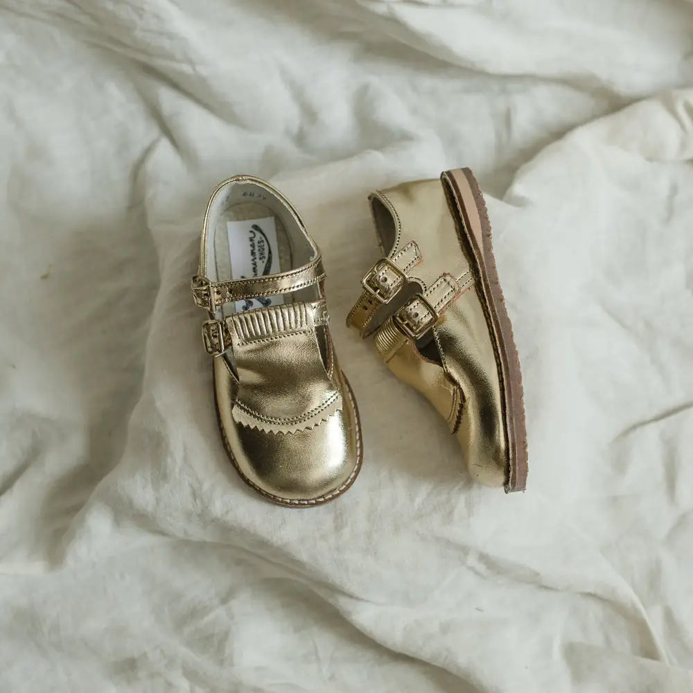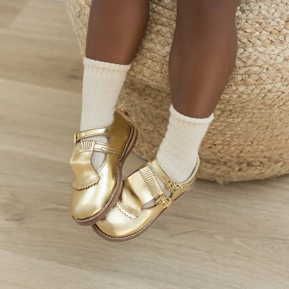 The Kiltie T-Strap in Gold is made of a genuine leather and lined in breathable leather which wicks away moisture. The structure of the shoe and the flexible rubber sole provide stability without weight to support your little one's early steps. The perfect style for everyday wear or special occasions!