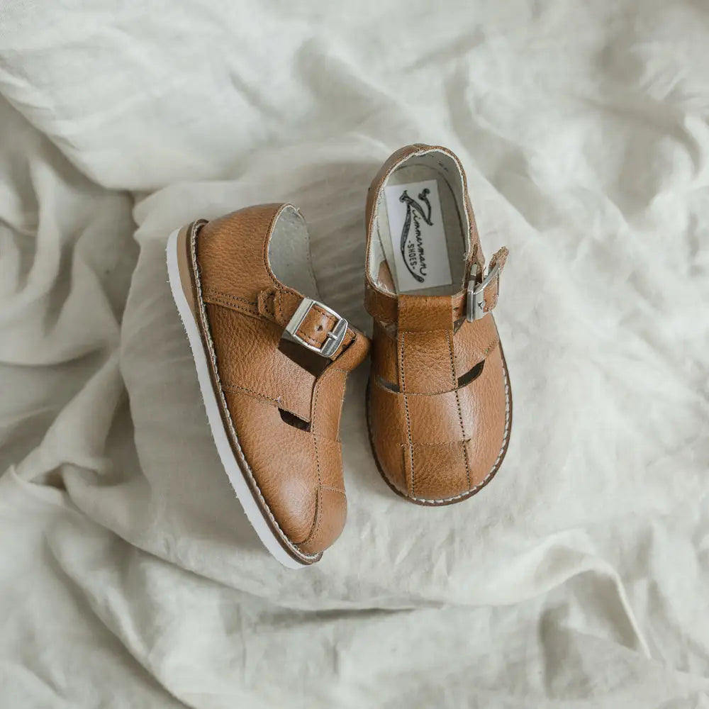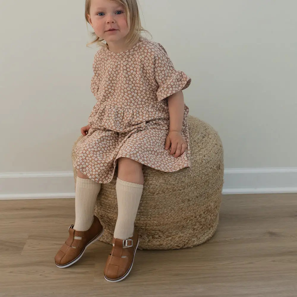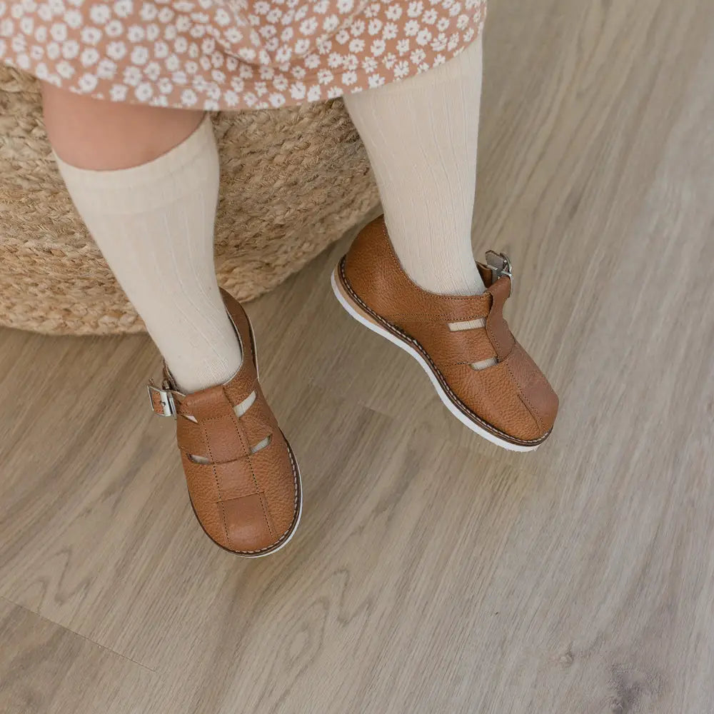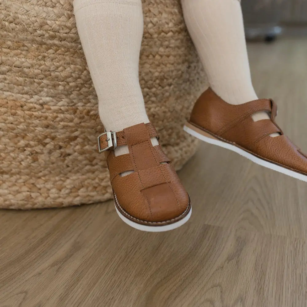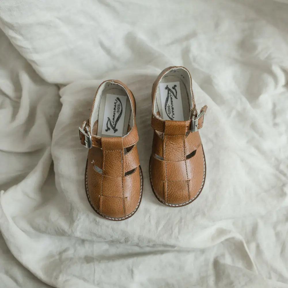 The Lucy T-Strap in Cognac is made of a genuine leather and lined in breathable leather which wicks away moisture. The structure of the shoe and the flexible rubber sole provide stability without weight to support your little one's early steps. This style features a buckle and clasp closure that makes it easy to take the shoe on and off. The perfect style for everyday wear or special occasions!