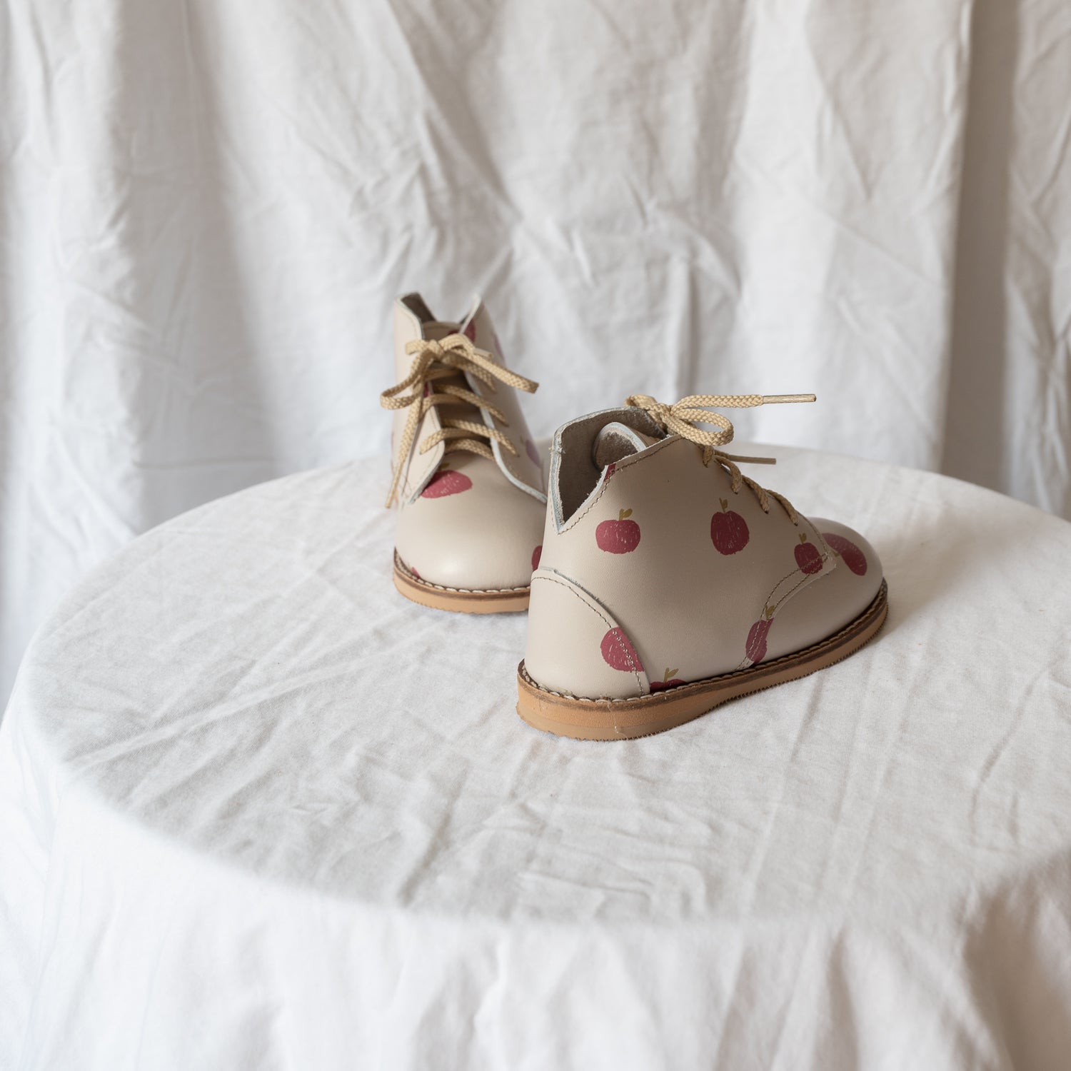 The Apple Milo Boot is made of top grain leather and fully lined in breathable leather to wick away moisture. The sole is made of a durable and flexible rubber, and the structure provides flexible stability without weight to support your little one's early steps. The hand-cut "V" notched out of the back makes slipping them on and off even easier. A favorite for stylish little ones!