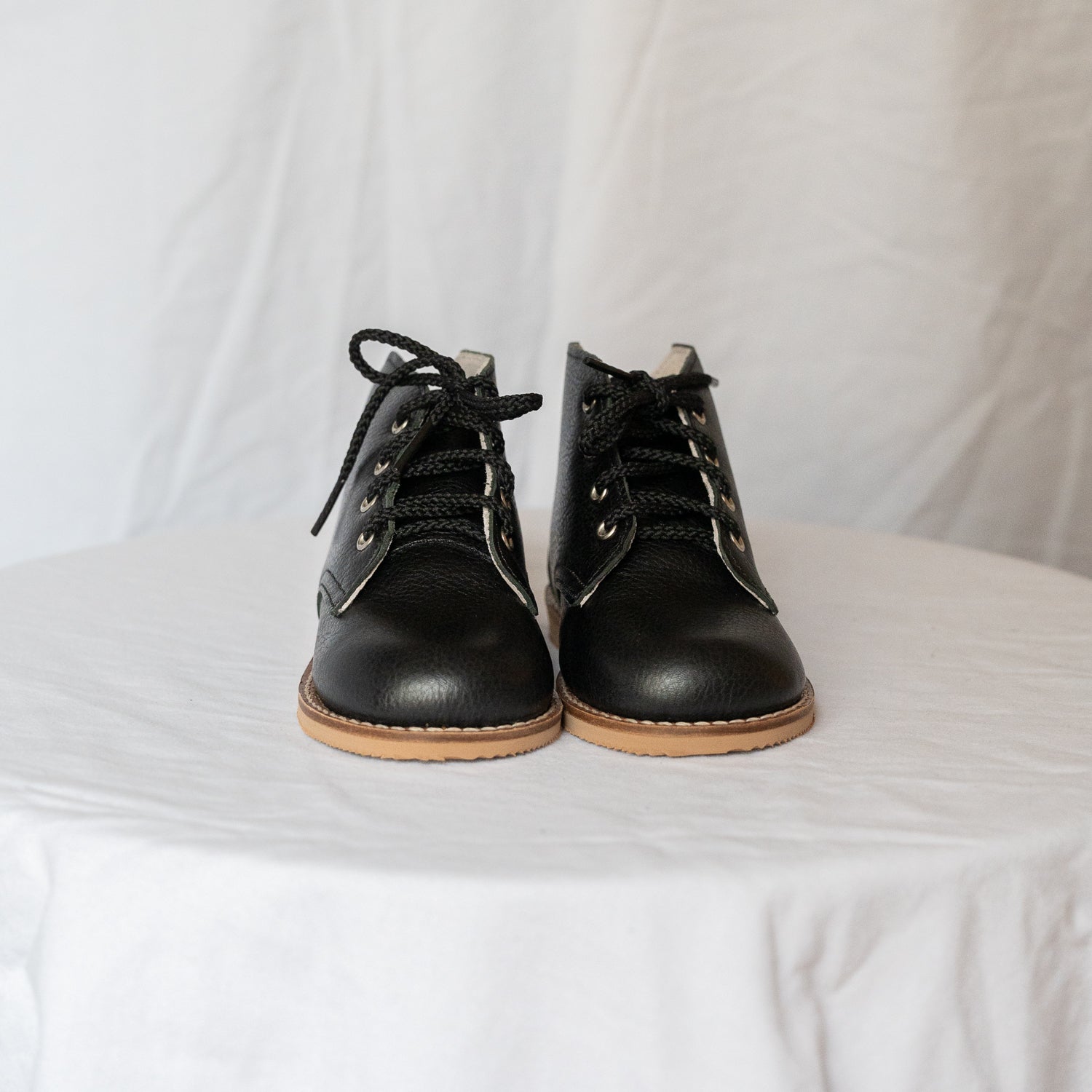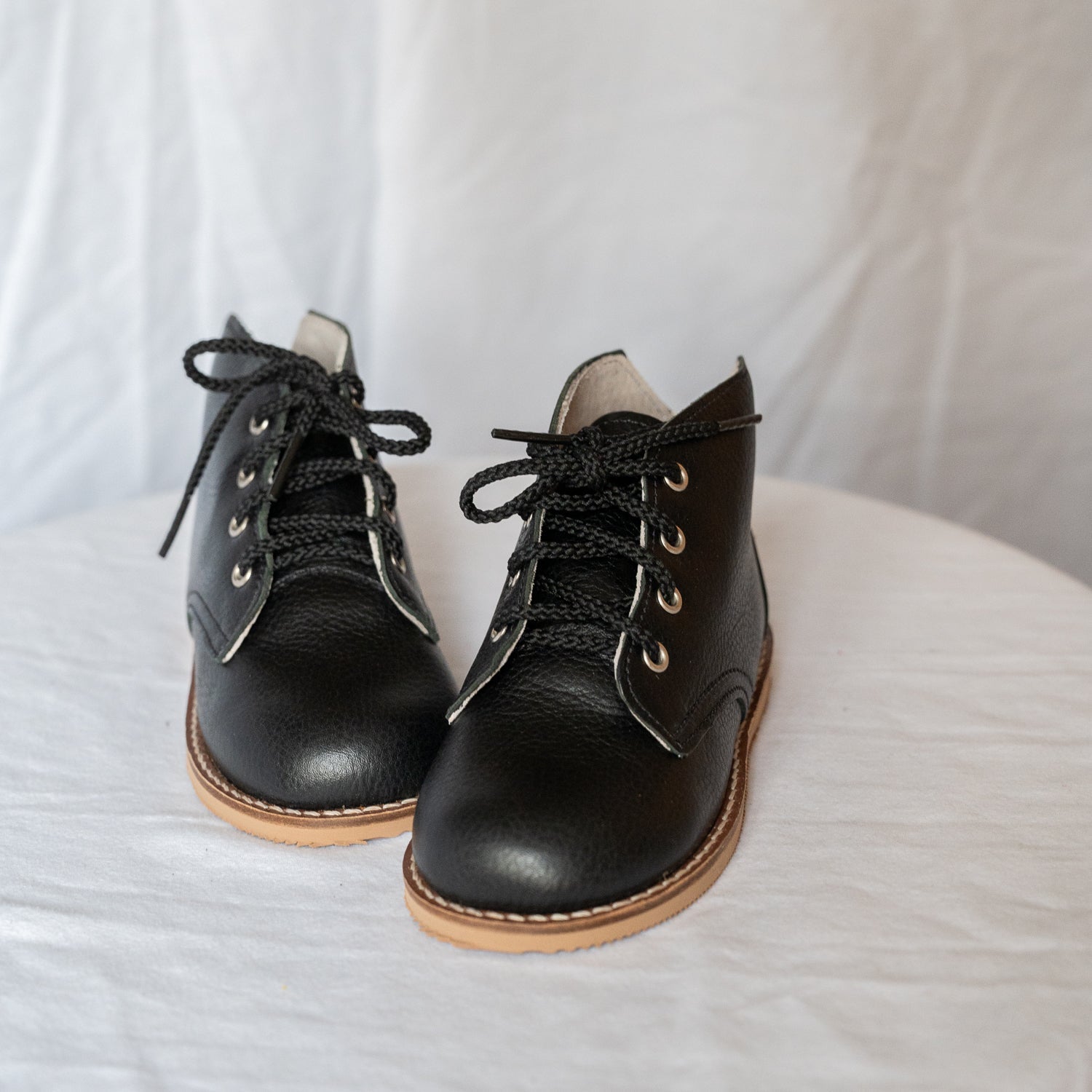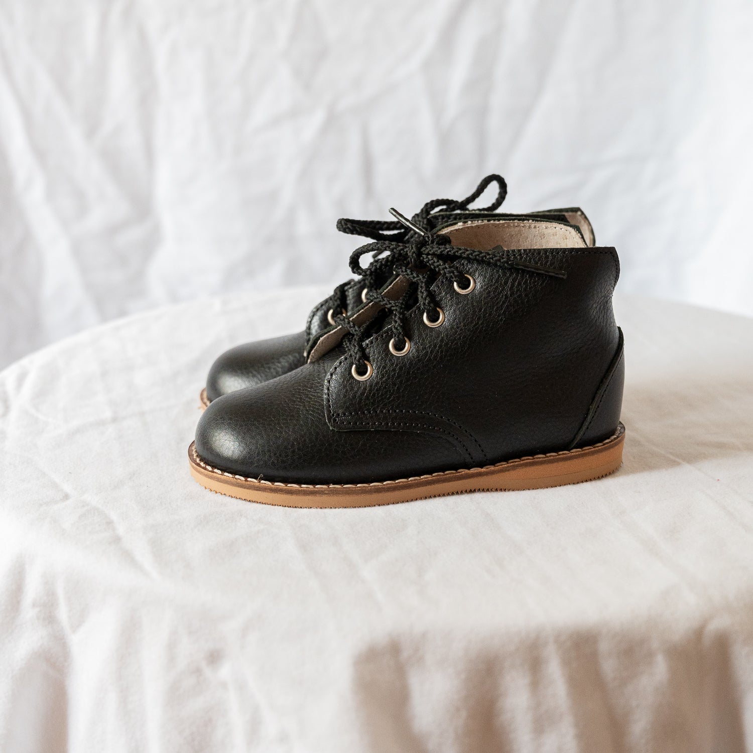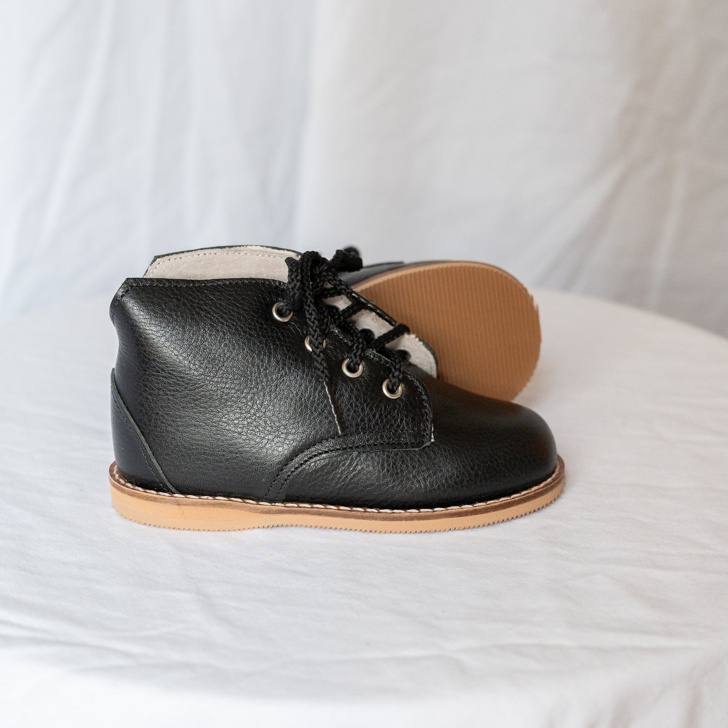 The Milo Boot in Black is made of genuine leather and fully lined in breathable leather to wick away moisture. The sole is made of a durable and flexible rubber, and the structure provides flexible stability without weight to support your little one's early steps. The hand-cut "V" notched out of the back makes slipping them on and off even easier. A favorite for stylish little ones!