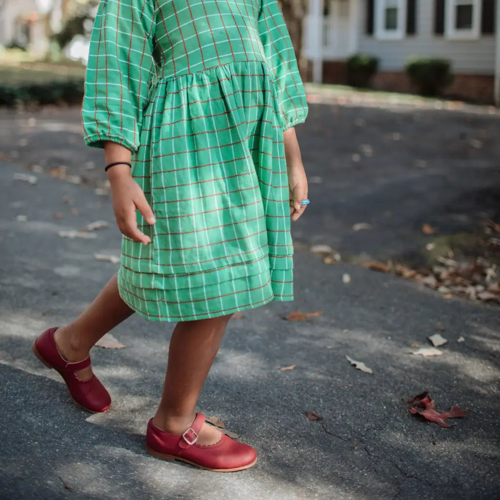 The Burgundy Mary Jane is made of a soft leather upper and lined in breathable leather and cotton which wick away moisture. The structure of the shoe and the flexible leather sole provide stability without weight to support your little girl's early steps.