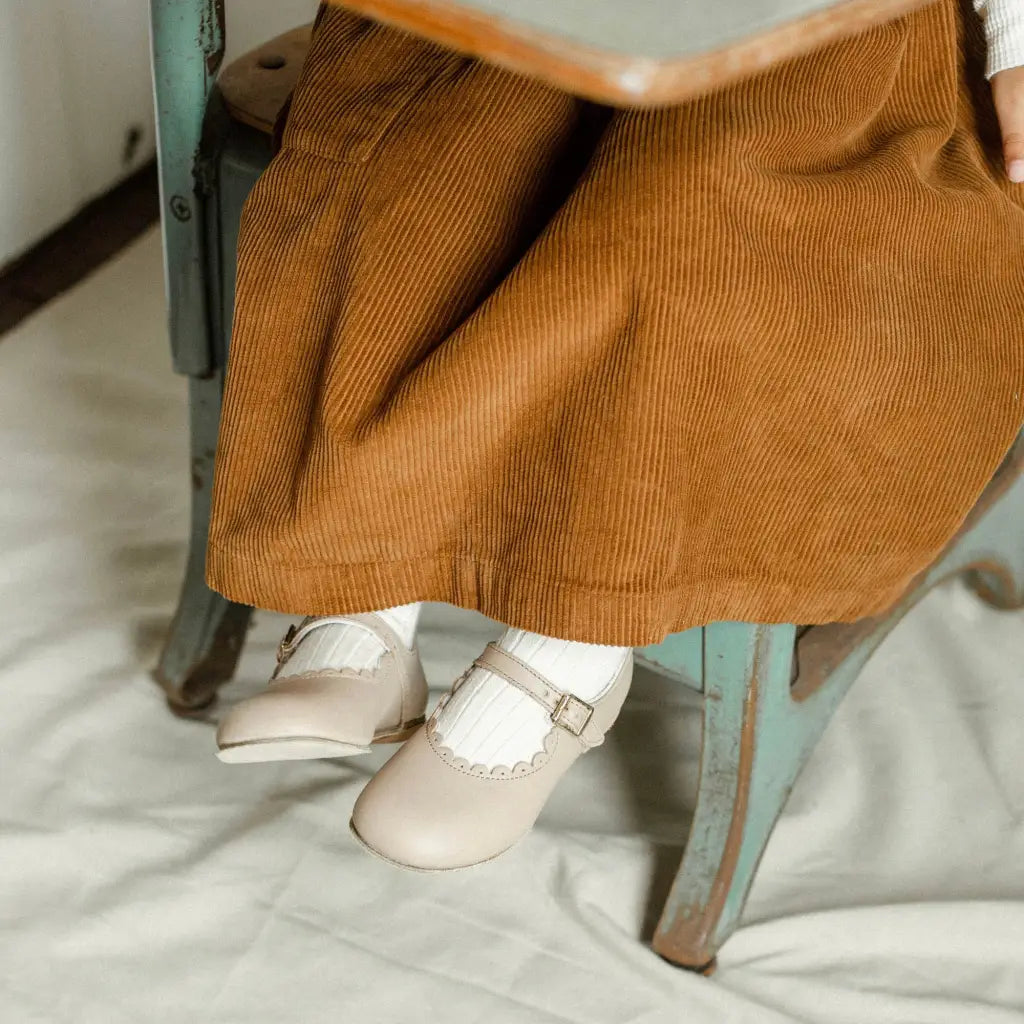 The Truffle Mary Jane is made of leather and lined in breathable leather and cotton which wick away moisture. The structure of the shoe and the flexible leather sole provide stability without weight to support your little one's early steps.
