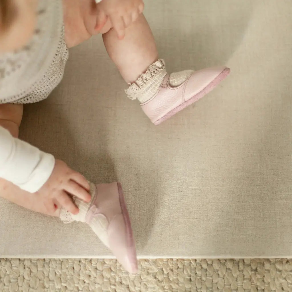 The Peony Soft Soled Mary Jane is made of soft leather and features an adjustable ankle strap. Our soft soled shoes are non-restrictive and perfect for infants who aren’t quite walking yet.